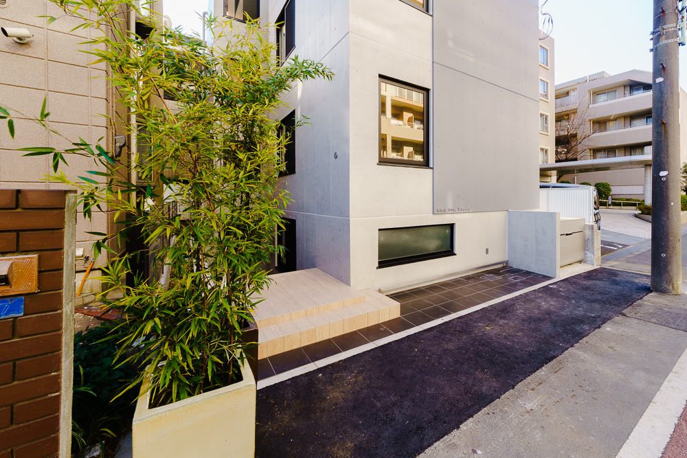 スタイリッシュなダストボックス選択し、コンクリートの造作でゾーニングすることで外観の印象を損ねないゴミ置き場もポイント。また、シンボルツリーを配置することで柔らかな印象が加わり、街路樹の多い周辺の街並みへの調和を生み出しています。