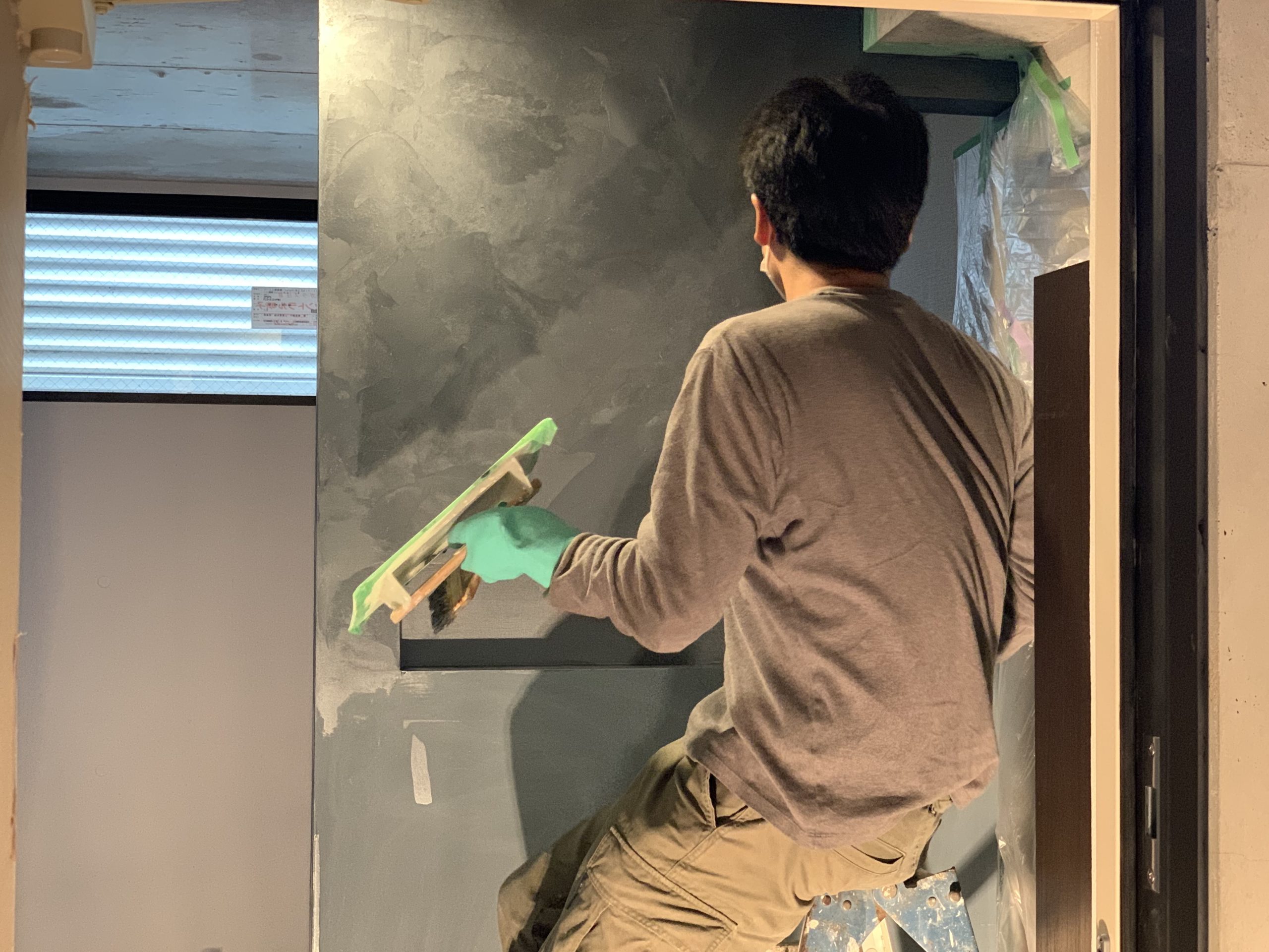 半地下の一室には、当社がご提案させて頂いた「アクセントウォール」を設置。南仏セニデコ社製の漆喰材を用い、コンクリートの無機質な素材感と合うシックなブルーグレーで空間を引き締めつつ、塗り壁ならではの手作りの温かみも醸し出しています。