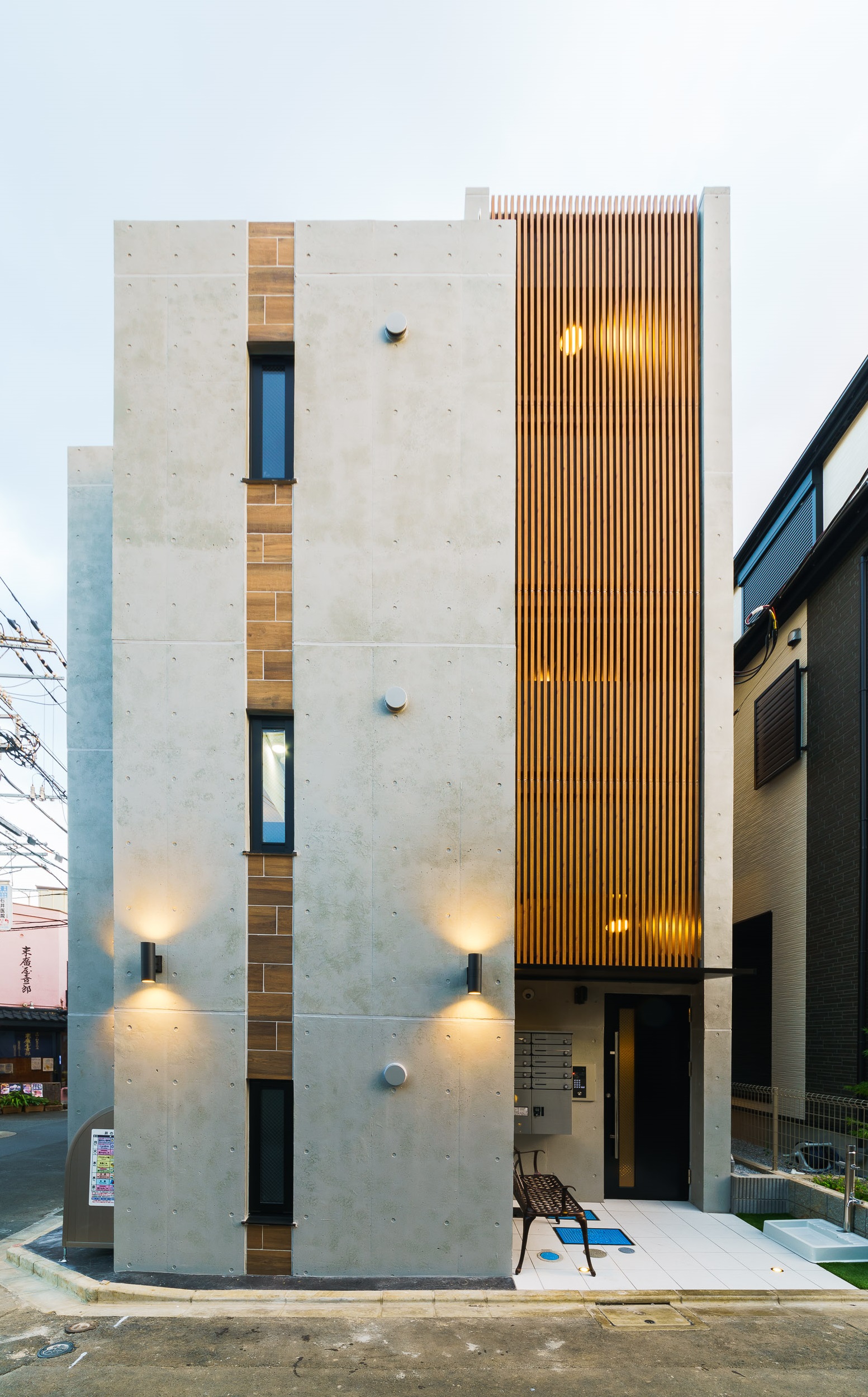 先日、当社で土地の仲介と建築業者のご紹介をさせて頂いた「吉祥寺 RC プロジェクト」が無事完成し、引き渡しを終えました。洗練された印象を与えるコンクリート打ち放しに、ポイントとして木目調のタイルや目隠しも兼ねた木調の縦格子を施し、温かみも感じられるデザインに。また、敷地の形状を活かした立体感のあるファサードで、街並みに調和しつつも存在感のある建物に仕上がっています。