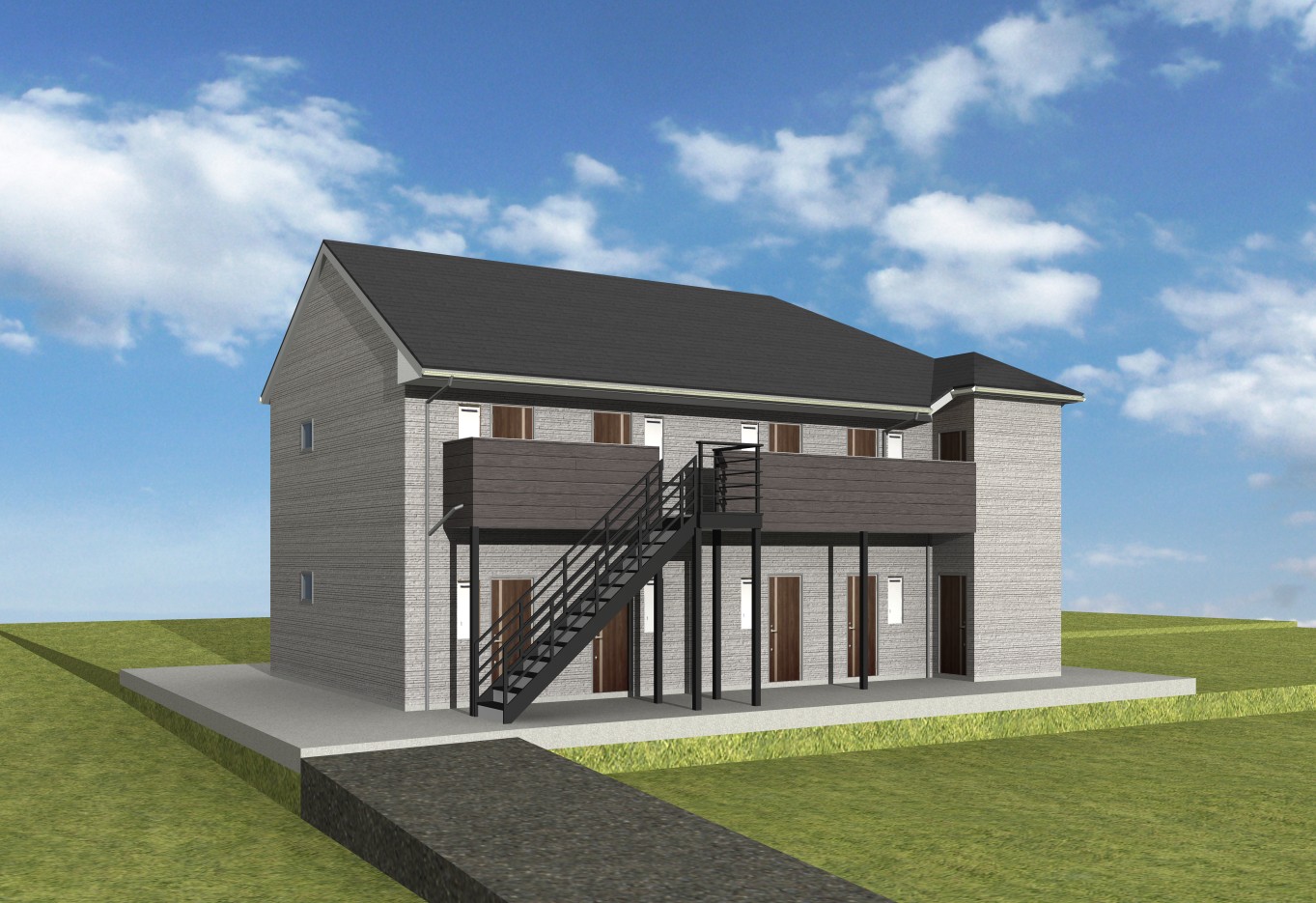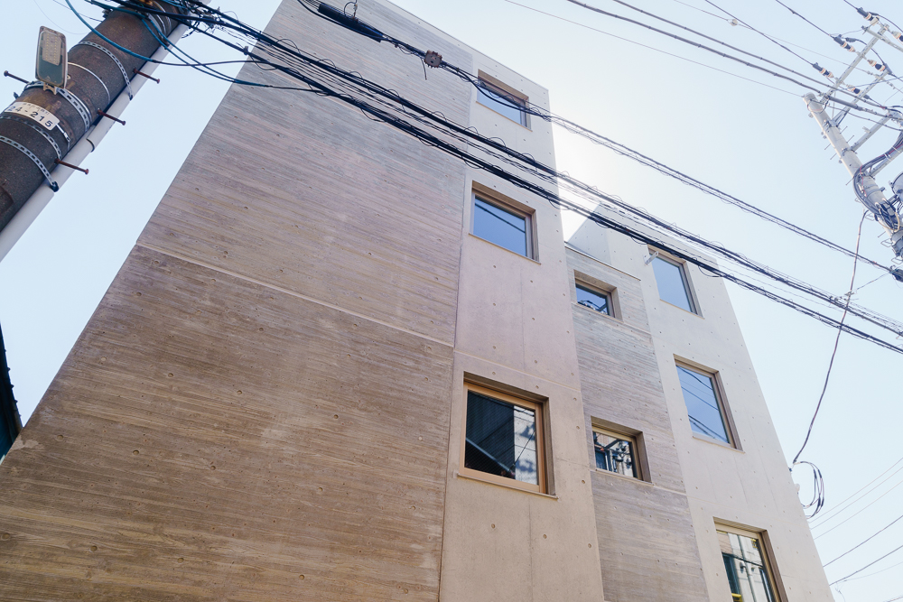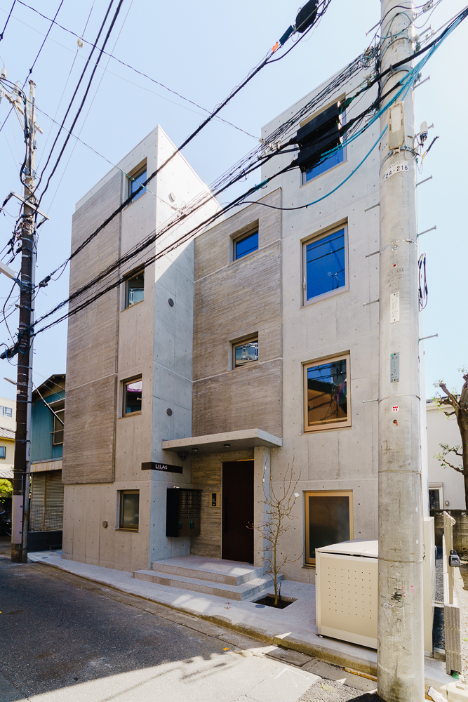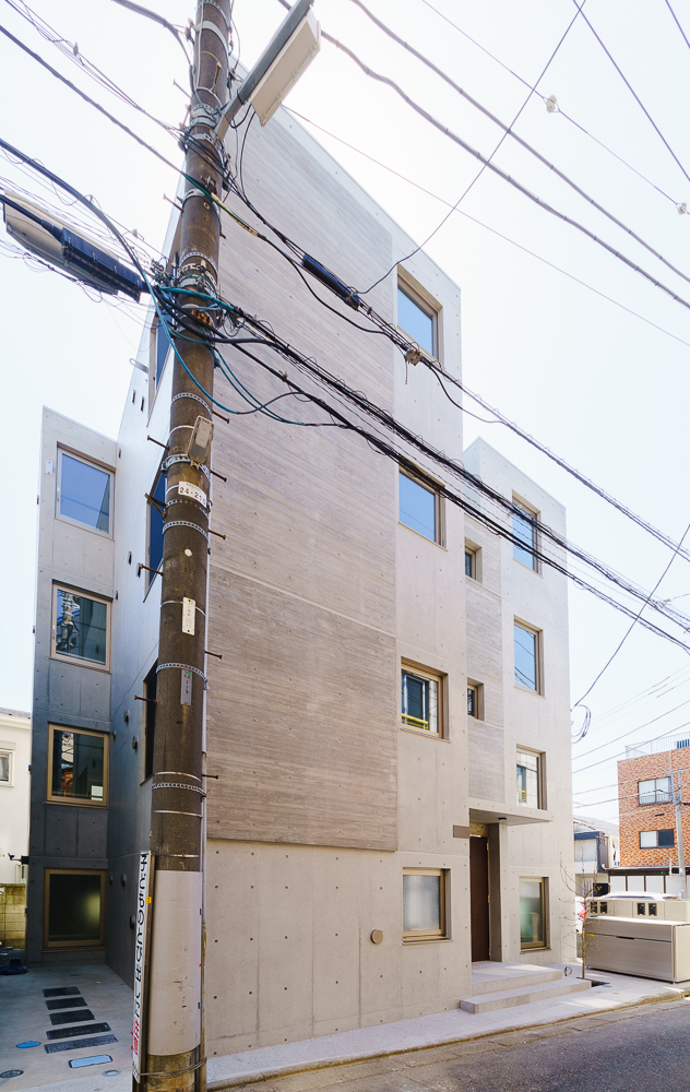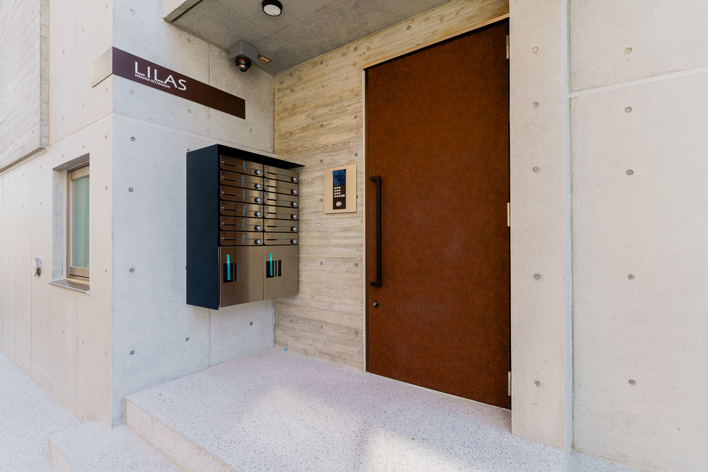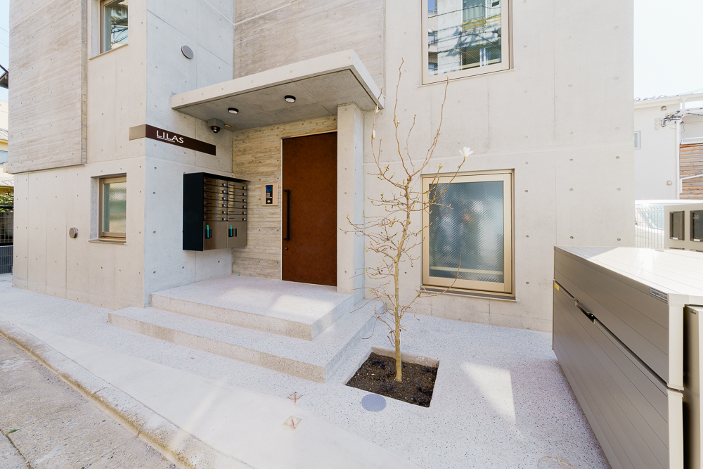 今回、オーナー様がコンセプトとして掲げられたのは、「ここから始まる。住まう人を幸せに導き、いつまでも心に残る建物を」。コンクリート打放しをベースとしつつ、一部に杉板の型枠を用いた木目模様を施すことによって陰影や色の差が生まれ、単調さのない洗練された印象に仕上がっています。また、サッシにステンカラーを採用したり、館銘板や玄関ドアにブラウン用いることで、本来コンクリートのもつ無機質な質感とはまた異なる、やわらかさや温かみを感じられる外観に仕上がりました。シンボルツリーも、木目と相性がよく外観を際立たせるアクセントになっています。エントランスの洗い出し二分石や、階段の塩ビシートもポイントです。