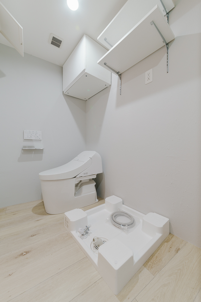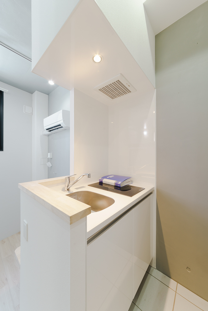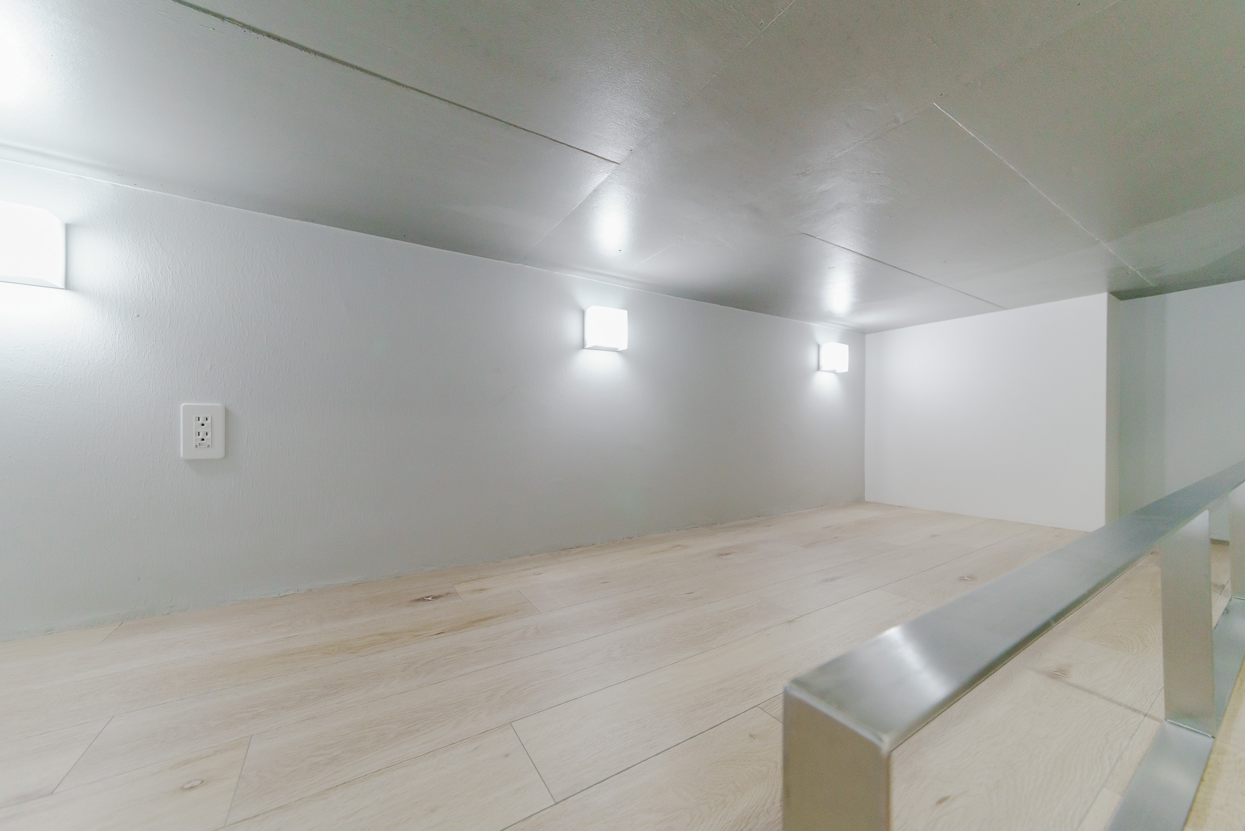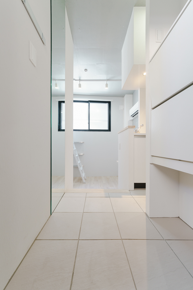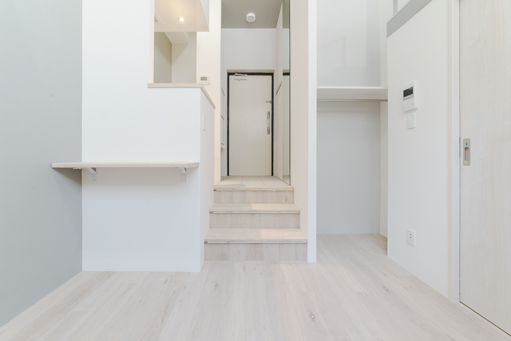 1階居室は半地下タイプですが、天井高を高くしロフトを設け、また床や壁・天井・扉を白を基調とした明るいカラーに統一したことで、暗さを感じさせないお部屋になっています。