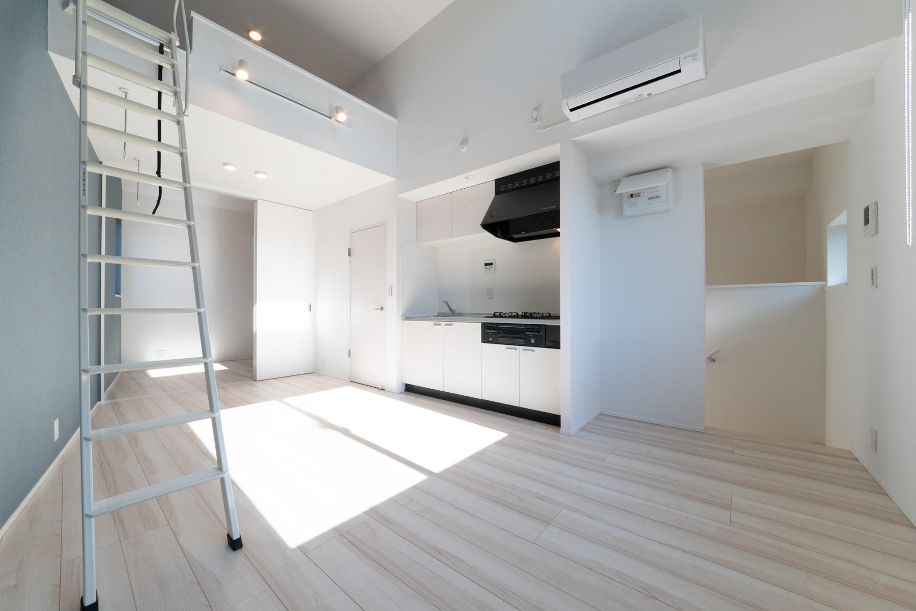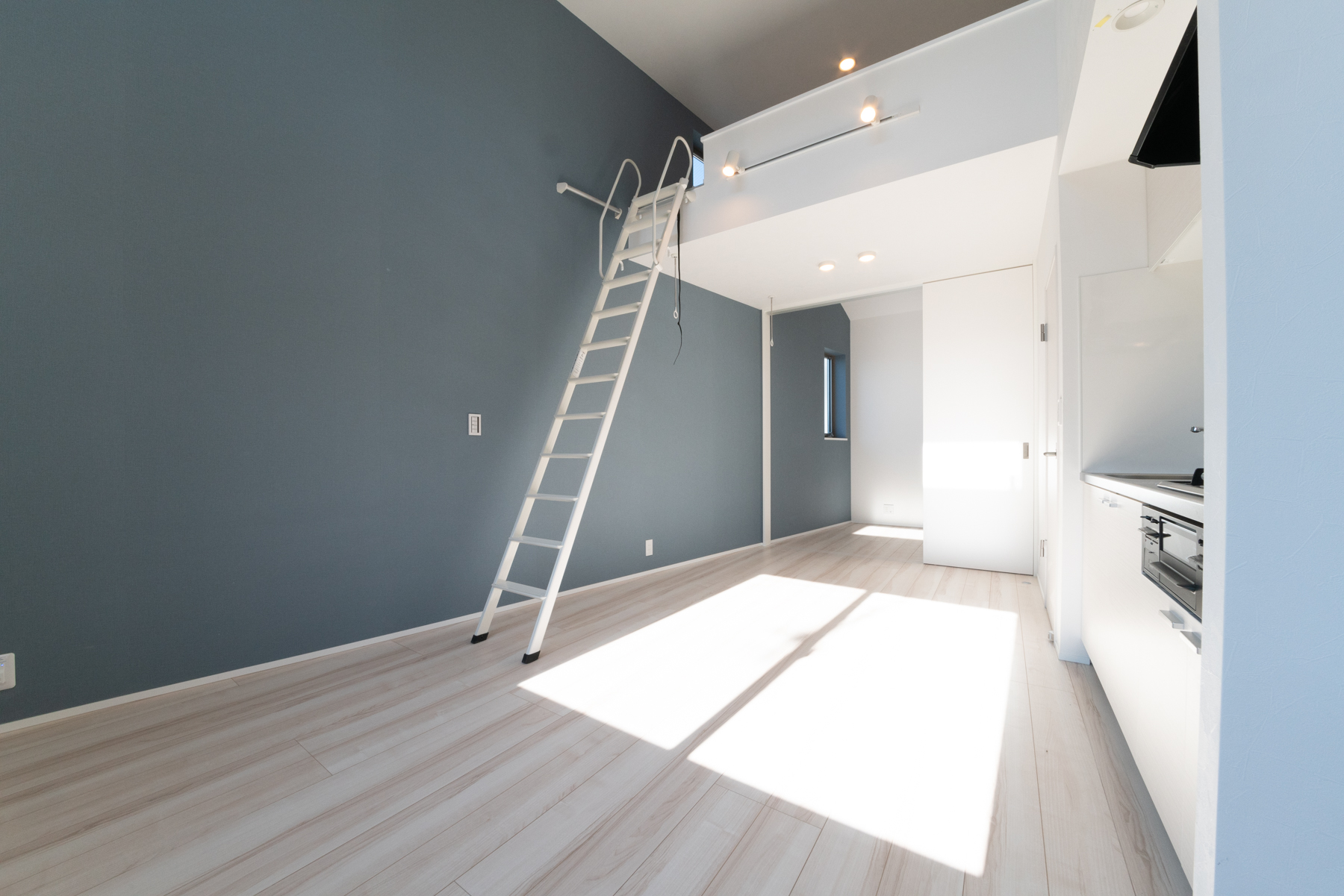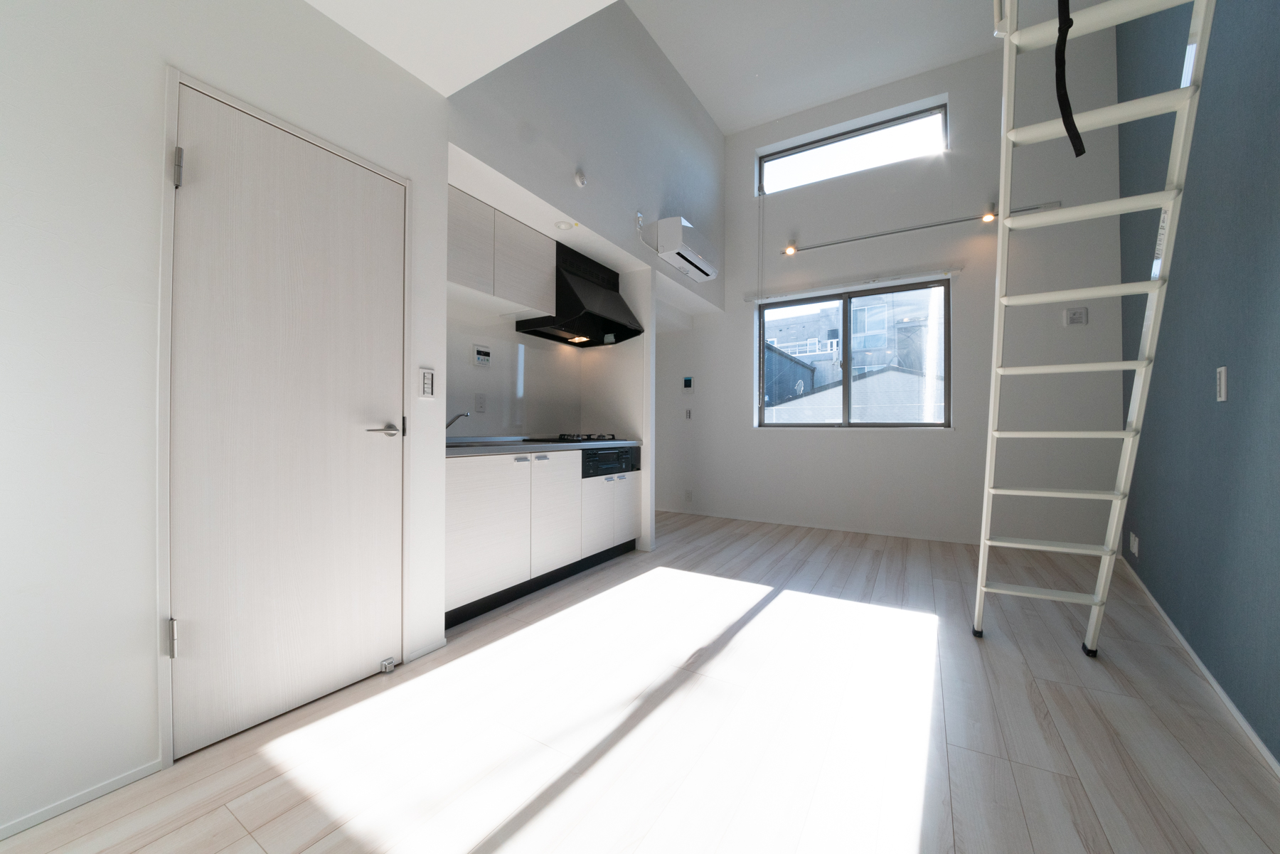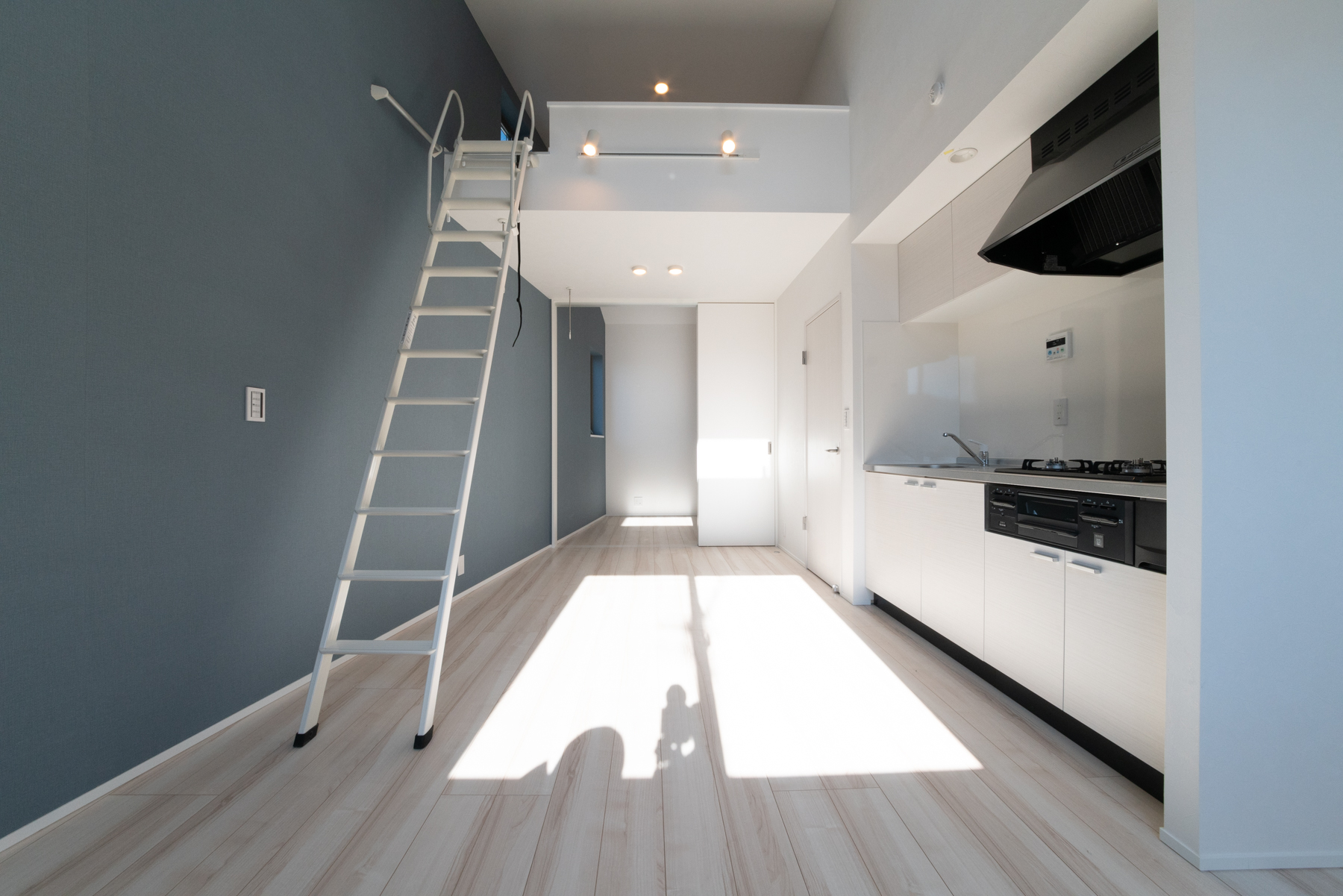 3階の1LDKの居室です。外観のイメージに合わせた、ブルーグレーのクロスがアクセントになっています。広々としたロフトや収納にも使えそうな大容量のシューズボックスも、入居される方にとってうれしいポイントです。