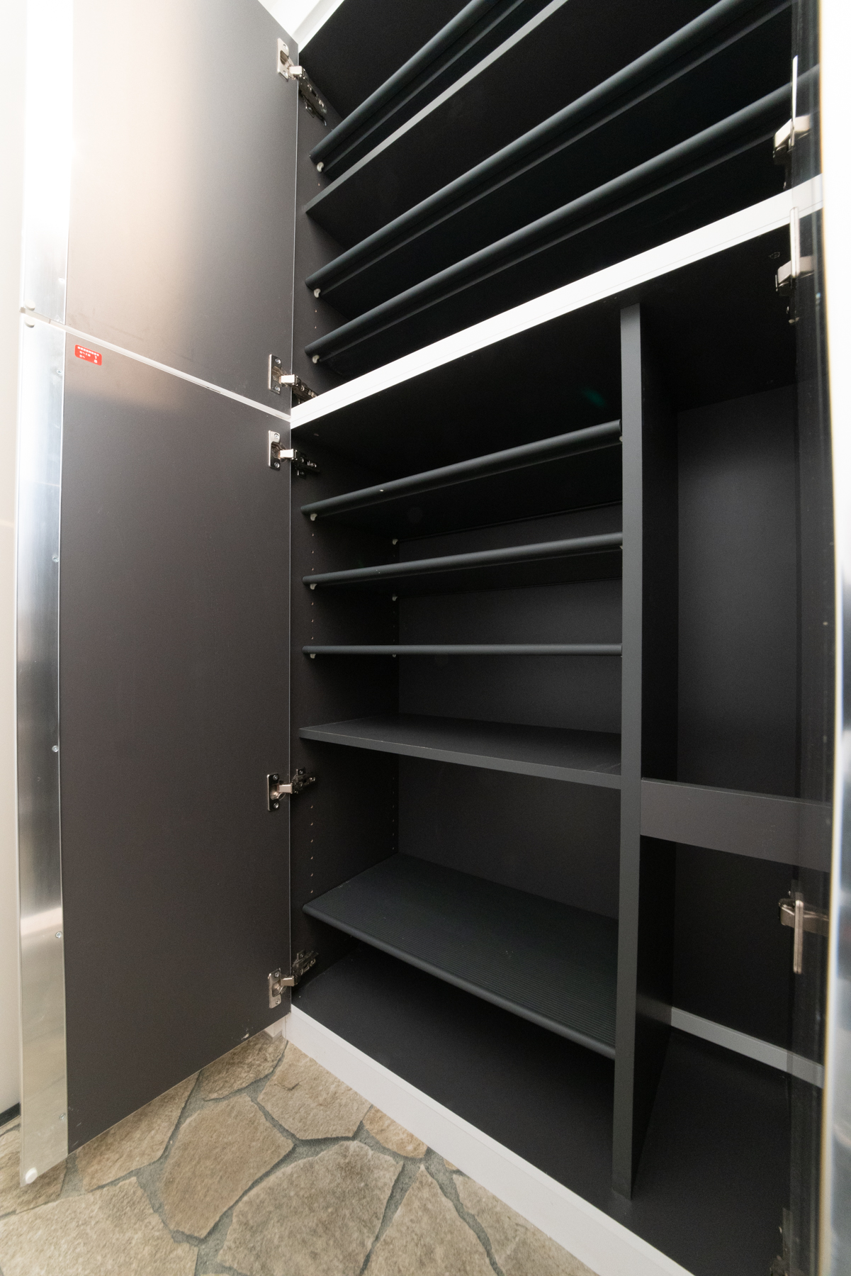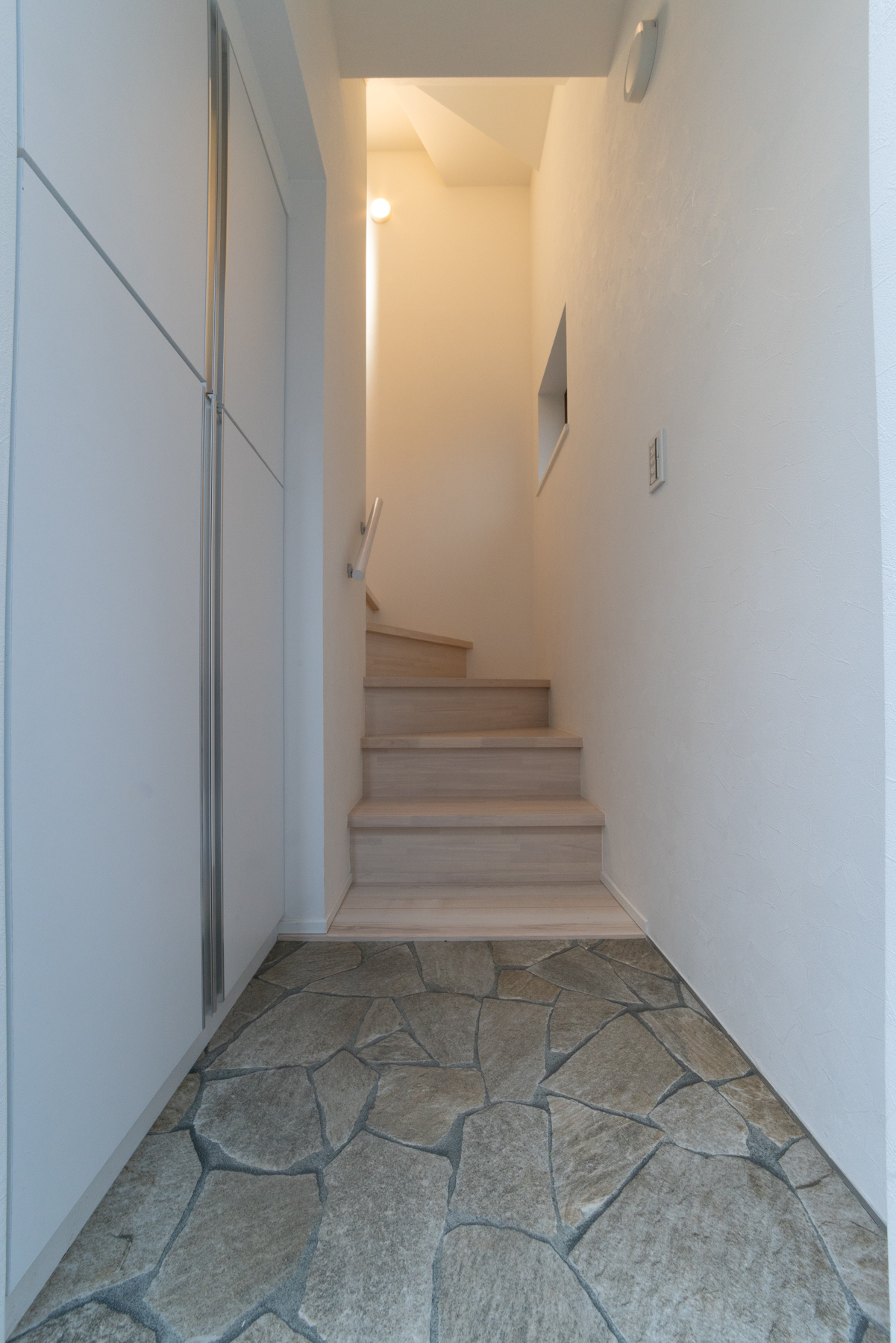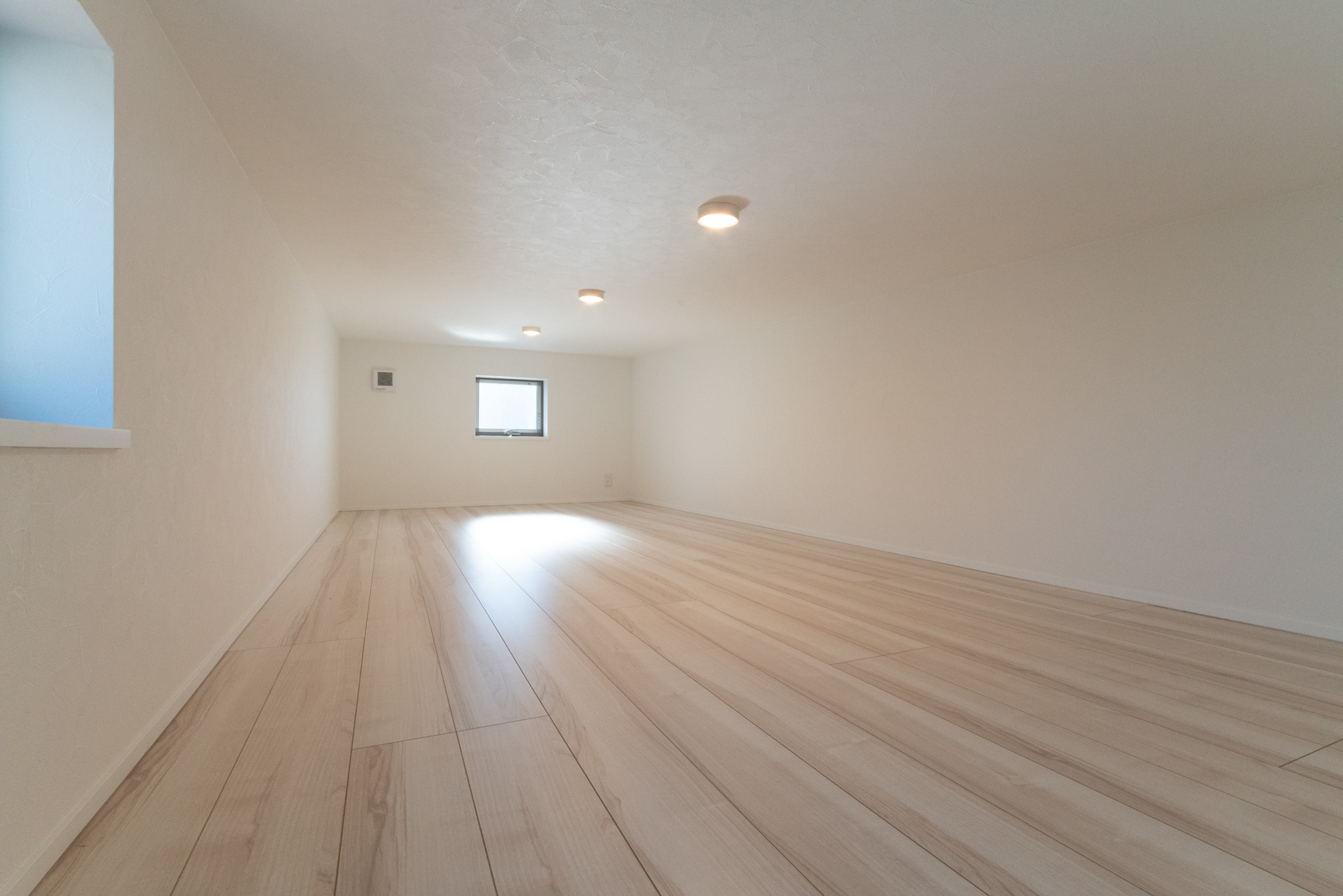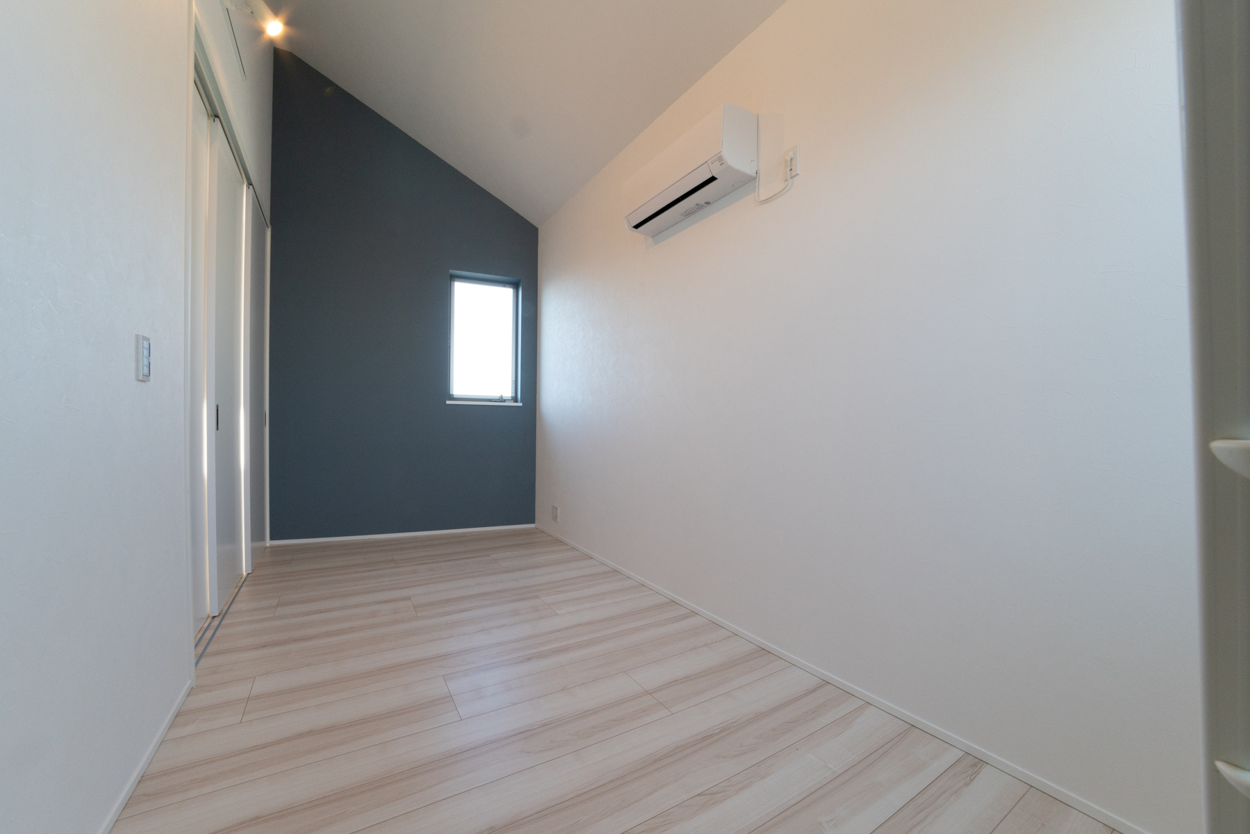 3階の1LDKの居室です。外観のイメージに合わせた、ブルーグレーのクロスがアクセントになっています。広々としたロフトや収納にも使えそうな大容量のシューズボックスも、入居される方にとってうれしいポイントです。